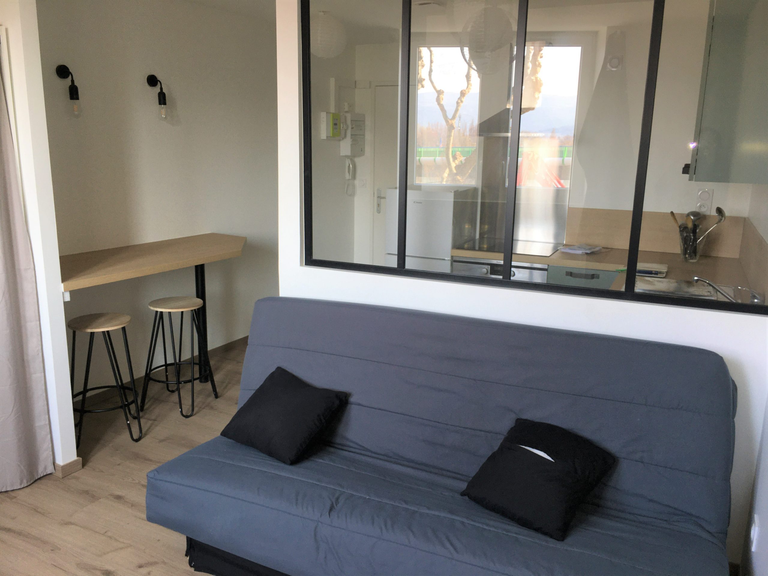 Le studio comprend une pièce à vivre avec un coin cuisine entièrement équipée et un coin salon/chambre avec placard séparé d’une verrière ainsi qu’une salle d’eau avec WC.